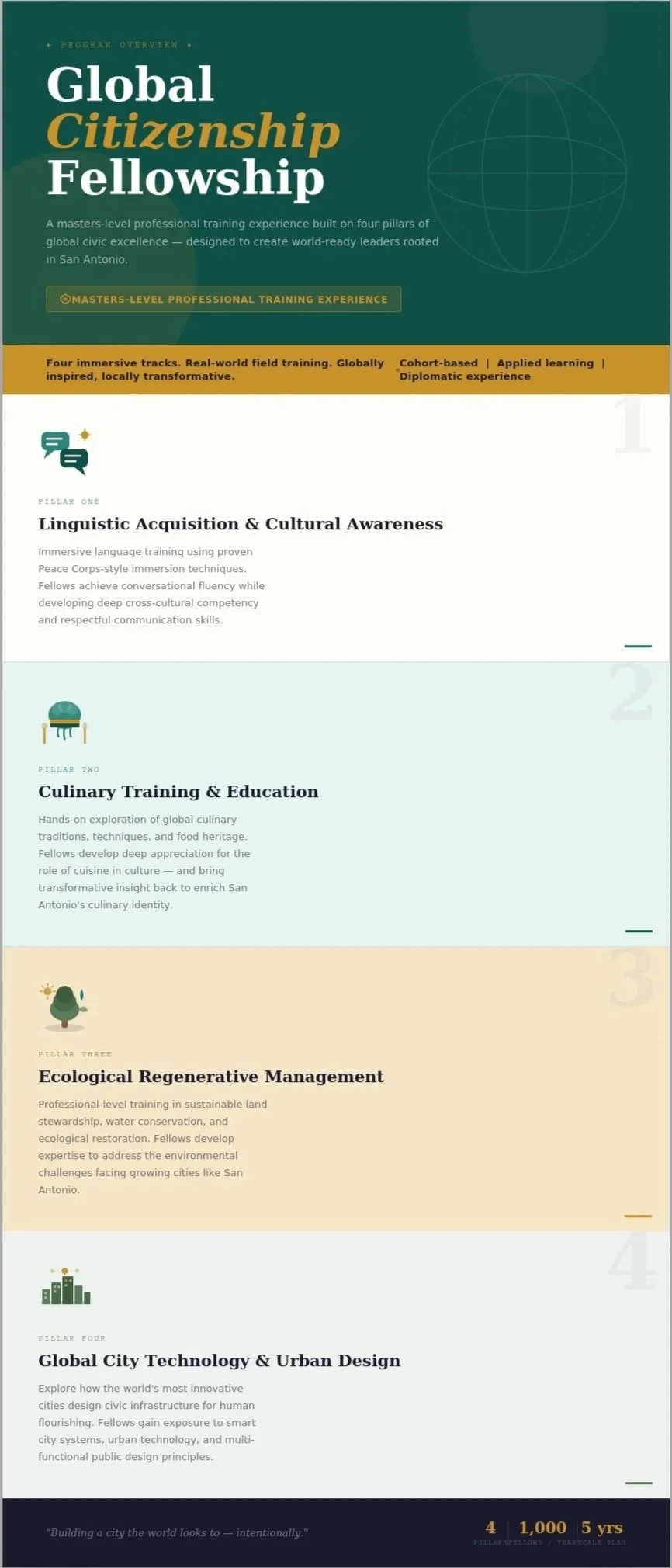 training experiences in Engineering, Urban Ecological Conservation, Regenerative Urban Farming, Transportation design and implementation, culinary arts, language immersion, and Urban Technology design.